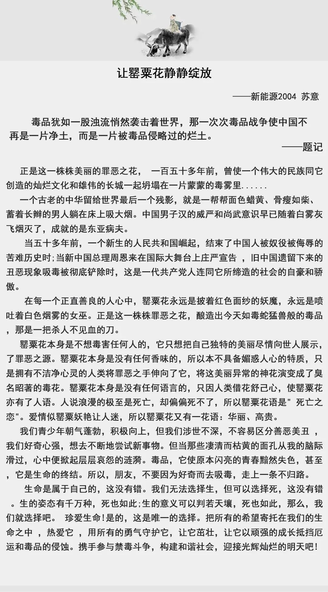 希望通过本次征文活动,能让同学们更加深刻地了解和认识毒品问题的有关知识,深刻认识毒品对个人、对家庭、对社会的巨大危害,同时也希望同学们能增强识毒、拒毒、防毒意识,提高抵御毒品侵蚀能力,享受“绿色无毒,健康人生”。