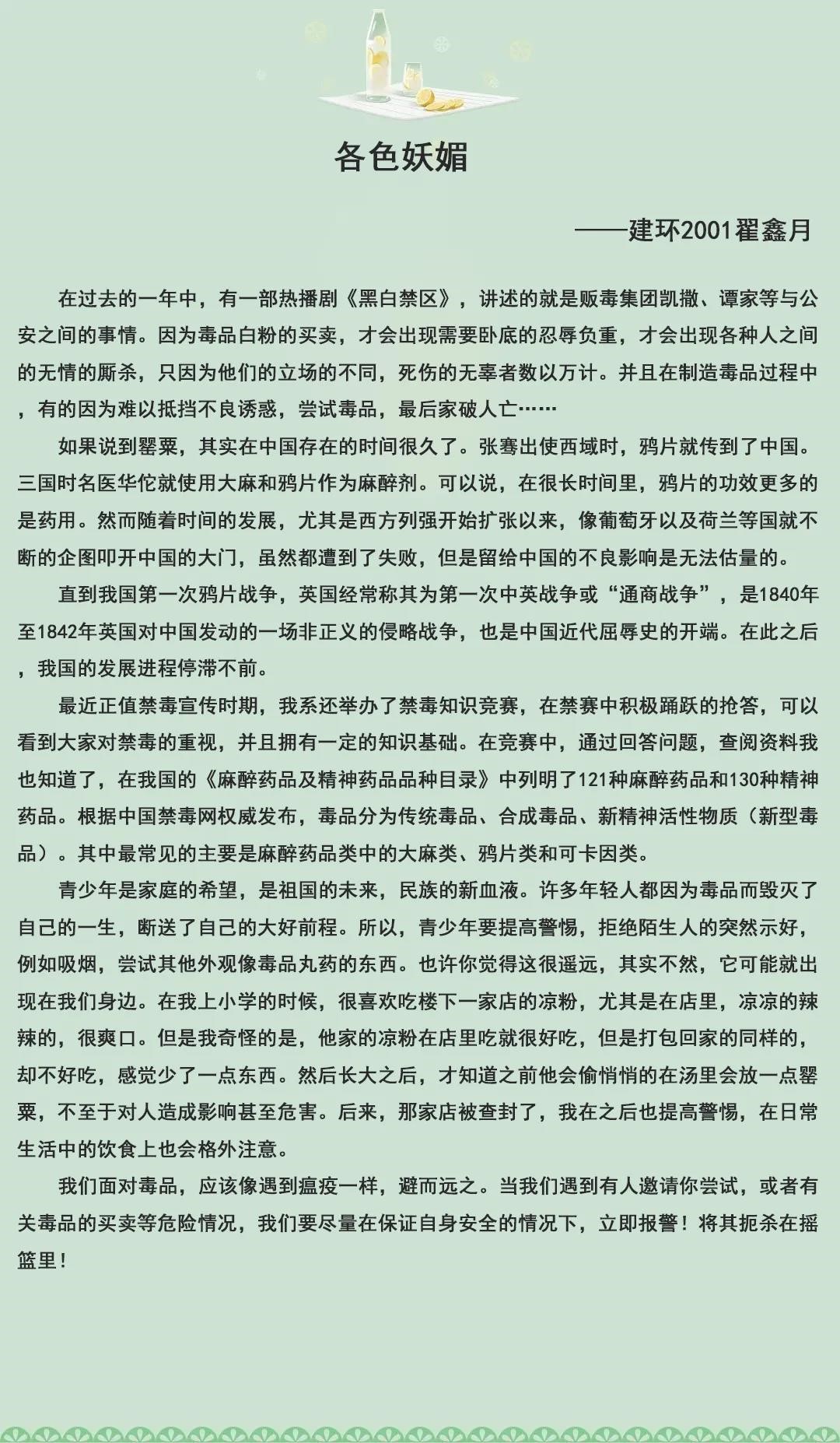 为不断加强青少年禁毒宣传教育,增强我院学生识毒、防毒、拒毒意识和能力,倡导“健康人生、绿色无毒”理念,我系于十月份举办了禁毒征文比赛。如今秋意正浓,我系征文比赛也圆满落幕。