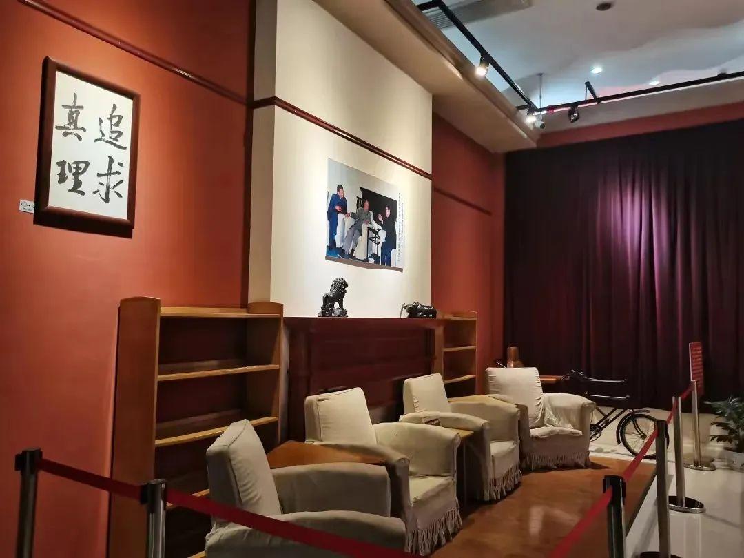 最令人印象深刻的是这间卧室,它陈设简单朴素,卧室里的床是医院淘汰下来的一张铁管床,两个床头柜也不一样,床边摆放的桌子是彭真患病后,让工作人员专门做的一个能架在床上的简易桌子。卧室里其他的书桌、书架、沙发、茶几等,也都是普通的、而且是拼凑起来的不配套的旧家具。就是这些旧家具,陪着他在晚年读书、看报、批阅文件;就在这间房子里,他和到访的中央、地方领导讨论国家大事。