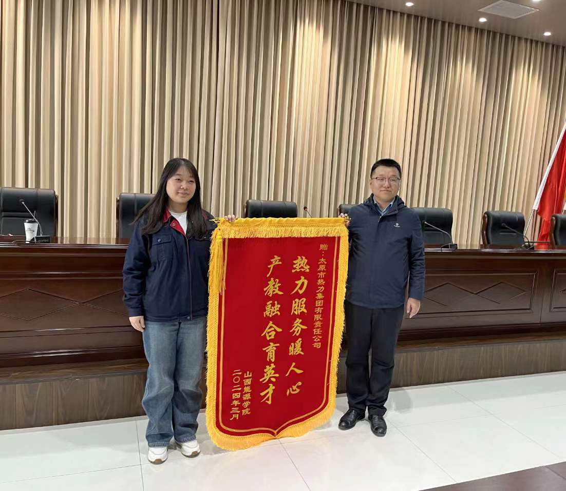 为表示对同学们学习的关心,赵杰副部长代表太原热力集团有限责任公司向参与实习的同学们赠送本单位编写的城镇供热系列图书,祝愿同学们学习进步。张传达副主任对此表示感谢,并代表能源与动力工程系广大师生回赠太原热力集团有限责任公司锦旗。