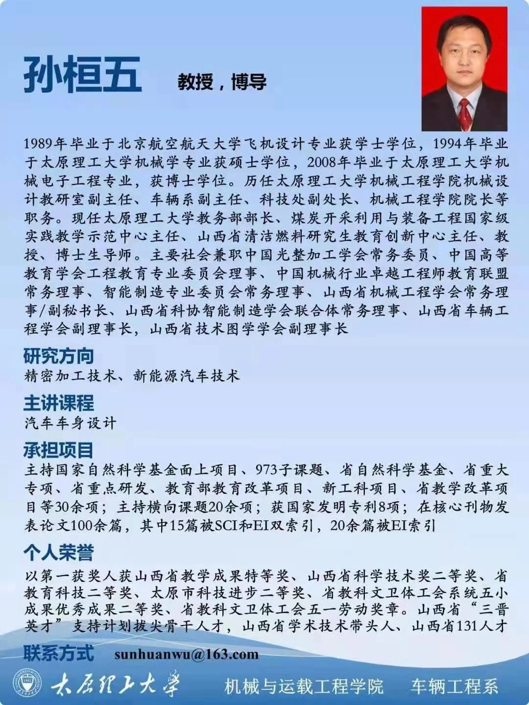 孙桓五教授,博导,1989年毕业于北京航空航天大学飞机设计专业获学士学位,1994年毕业于太原理工大学机械学专业获硕士学位,2008年毕业于太原理工大学机械电子工程专业,获博士学位。历任太原理工大学机械工程学院机械设计教研室副主任、车辆系副主任、科技处副处长、机械工程学院院长等职务。现任太原理工大学教务部部长、煤炭开采利用与装备工程国家级实践教学示范中心主任、山西省清洁燃料研究生教育创新中心主任、教授、博士生导师。主要社会兼职中国光整加工学会常务委员、中国高等教育学会工程教育专业委员会理事中国机械行业卓越工程师教育联盟常务理事、智能制造专业委员会常务理事、山西省机械工程学会常务理事/副秘书长、山西省科协智能制造学会联合体常务理事、山西省车辆工程学会副理事长,山西省技术图学学会副理事长。