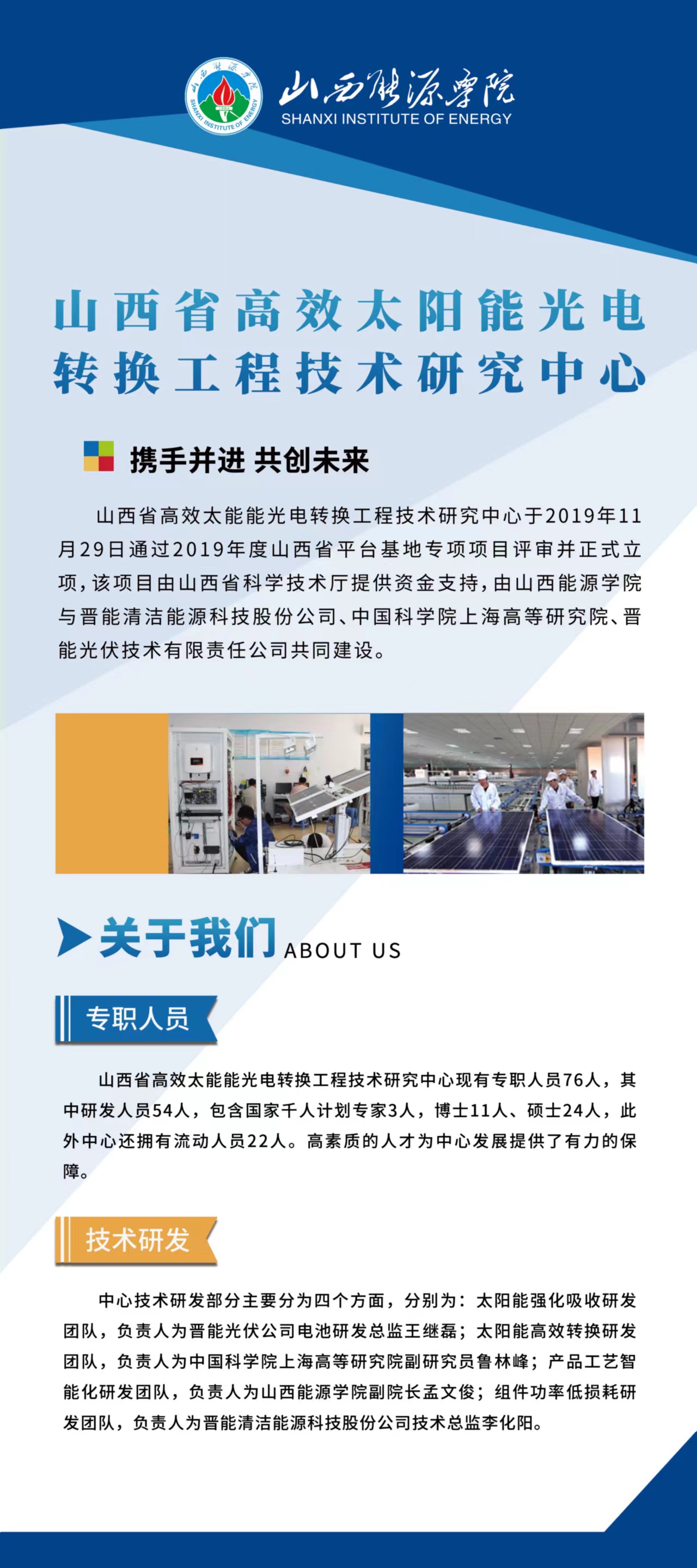 山西省高效太阳能光电转换工程技术研究中心于2019年11月29日通过2019年度山西省平台基地专项项目评审并正式立项,该项目由山西省科学技术厅提供资金支持,由太阳集团官网与晋能清洁能源科技股份公司、中国科学院上海高等研究院、晋能光伏技术有限责任公司共同建设。
