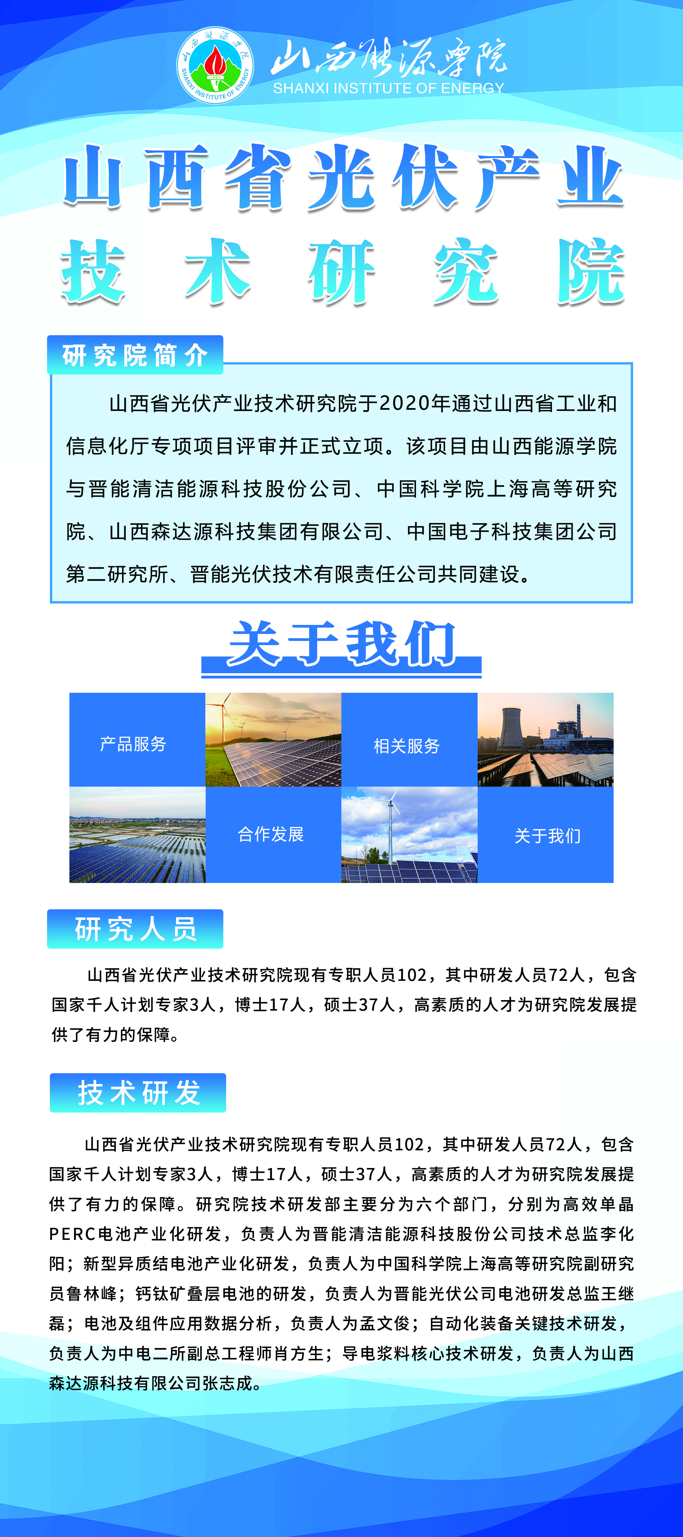 山西省光伏产业技术研究院于2020年通过山西省工业和信息化厅专项项目评审并正式立项。该项目由太阳集团官网与晋能清洁能源科技股份公司、中国科学院上海高等研究院、山西森达源科技集团有限公司、中国电子科技集团公司第二研究所、晋能光伏技术有限责任公司共同建设。