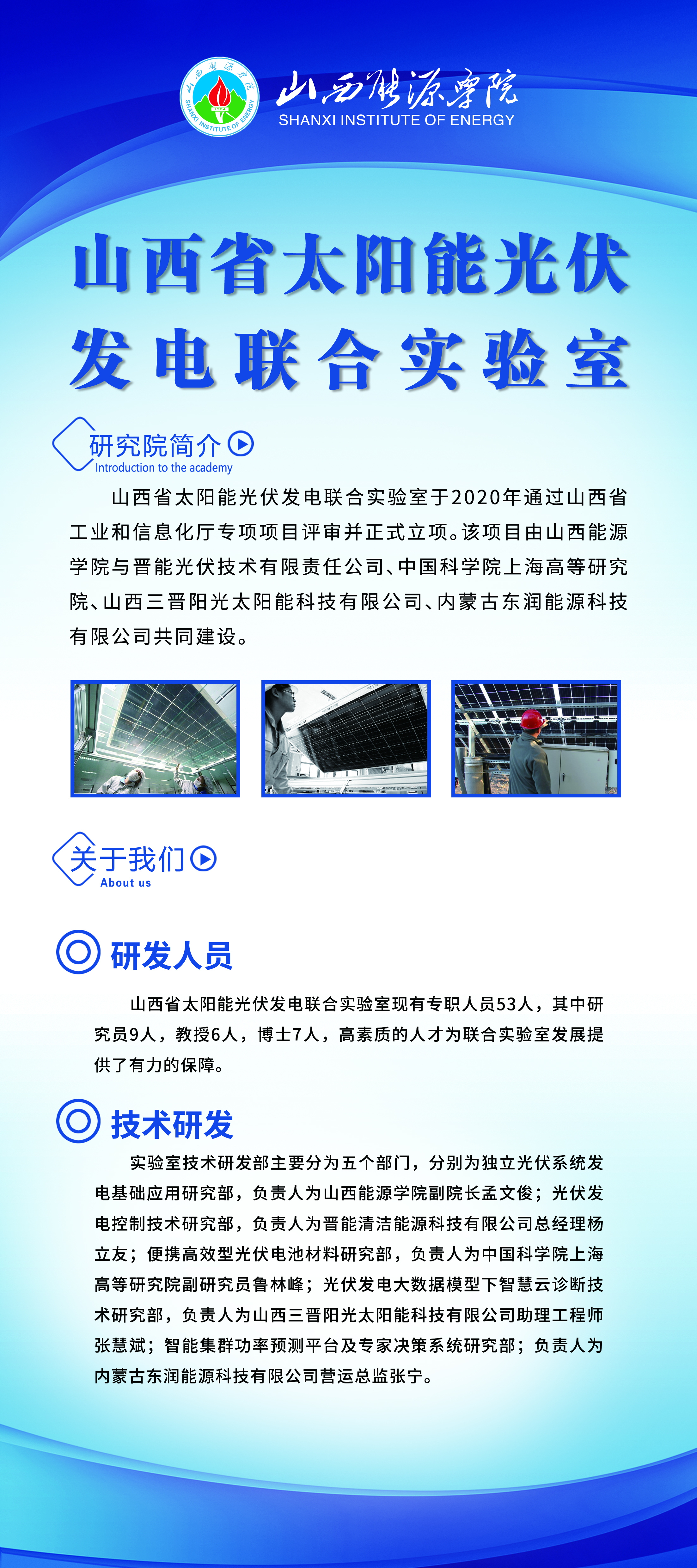 山西省太阳能光伏发电联合实验室现有专职人员53人,其中研究员9人,教授6人,博士7人,高素质的人才为联合实验室发展提供了有力的保障。实验室技术研发部主要分为五个部门,分别为独立光伏系统发电基础应用研究部,负责人为能源与动力工程系主任侯红;光伏发电控制技术研究部,负责人为晋能清洁能源科技有限公司总经理杨立友;便携高效型光伏电池材料研究部,负责人为中国科学院上海高等研究院副研究员鲁林峰;光伏发电大数据模型下智慧云诊断技术研究部,负责人为山西三晋阳光太阳能科技有限公司助理工程师张慧斌;智能集群功率预测平台及专家决策系统研究部;负责人为内蒙古东润能源科技有限公司营运总监张宁。