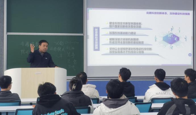 12月27日下午,由科技产业部主办、思想政治理论课教学部承办的“学院大讲堂”系列学术讲座在综合楼206智慧教室举行。太原理工大学马克思主义学院副教授、硕士生导师王青山应邀作了题为“加快建设教育强国、科技强国、人才强国”的学术讲座。讲座由思想政治理论课教学部副主任张明花主持,学院青马工程全体学员与思政课教师参加讲座。