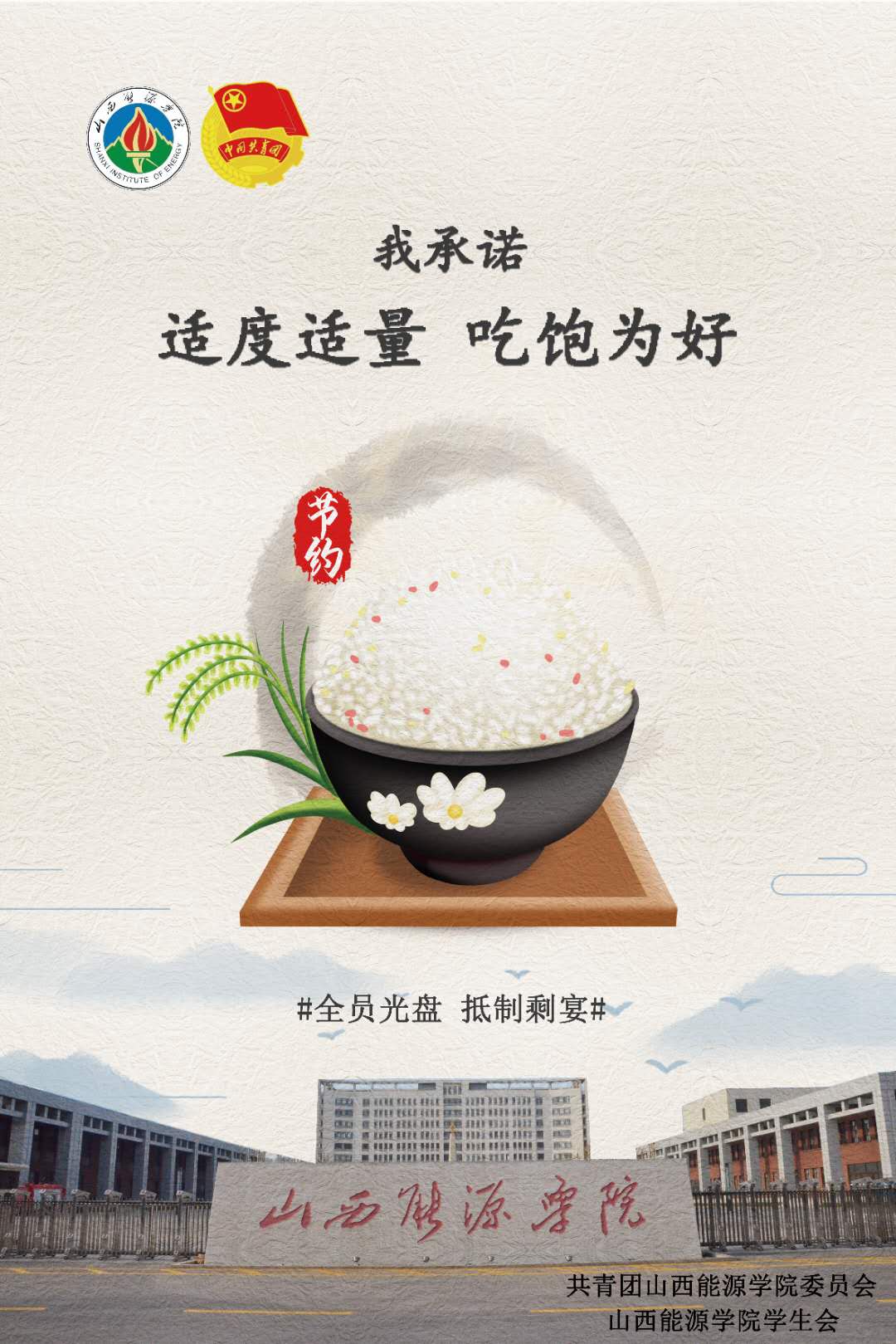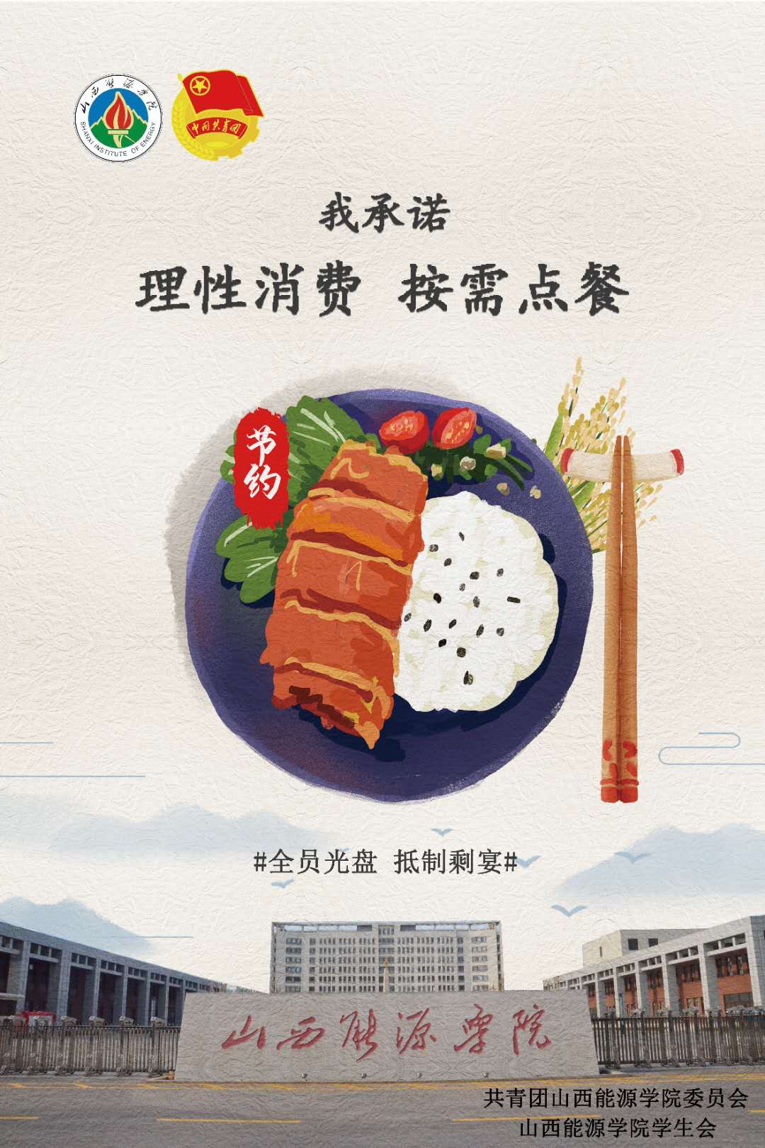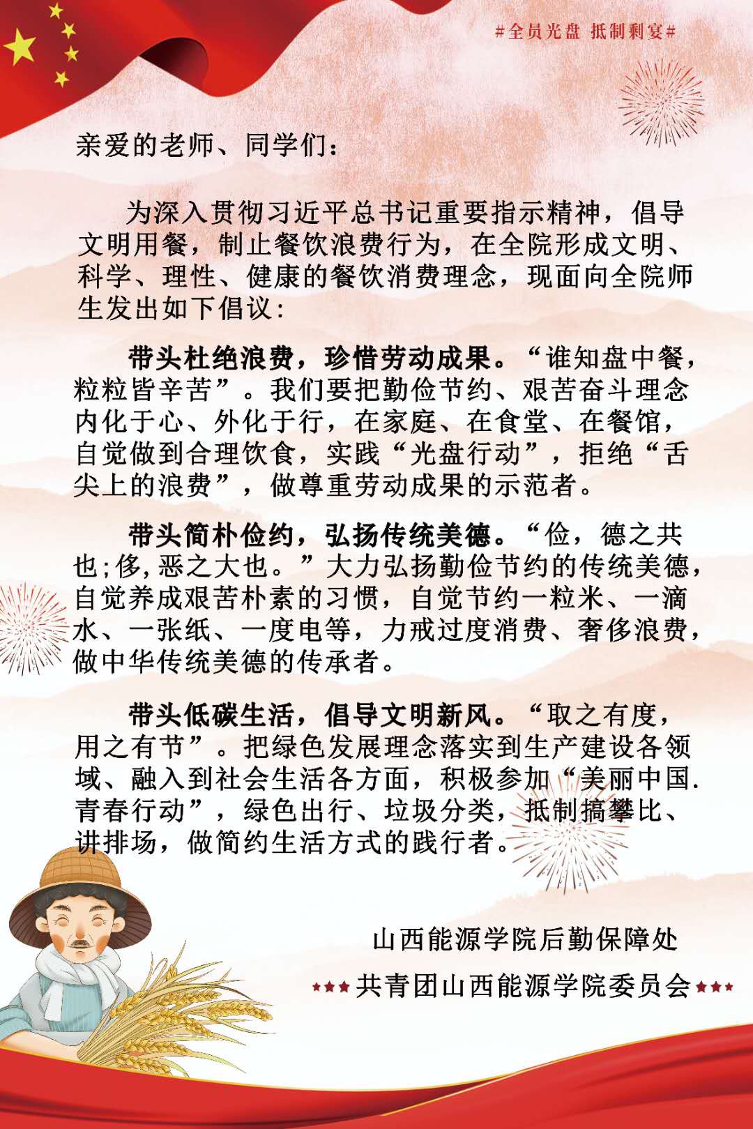 为深入贯彻习近平总书记重要指示精神,倡导文明用餐,制止餐饮浪费行为,在全院形成文明、科学、理性、健康的餐饮消费理念,现面向全院师生发出如下倡议: