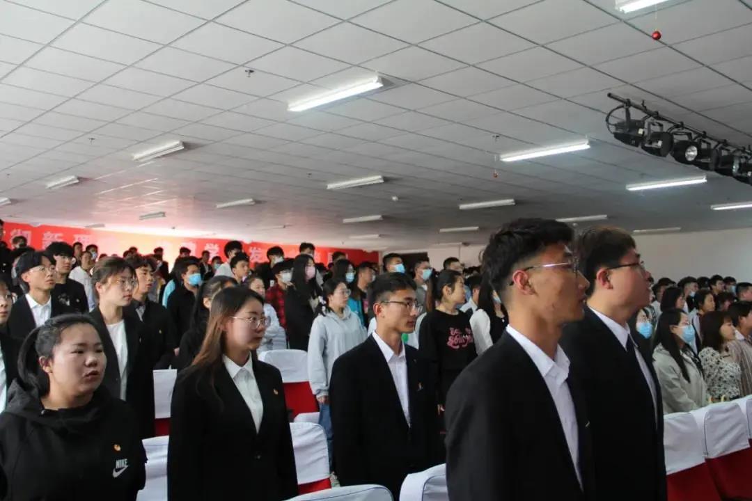 面对鲜红的团旗,全体新团员举起右拳,在电力系分团委书记谢雪丹老师的带领下庄严宣誓,表达出不忘初心跟党走,为共产主义奋斗终身的坚定信念。