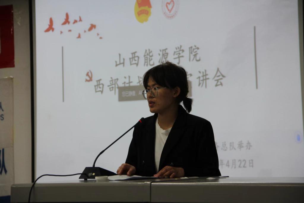 我校2022年西部计划志愿者张翠芳针对奔赴西部的理由展开自己的西部计划经历分享,通过视频、图片的生动方式,从热血青春、机遇成长、责任担当进行讲述分享。她表示这是时代赋予我们的责任,也是青年一代的使命与担当。