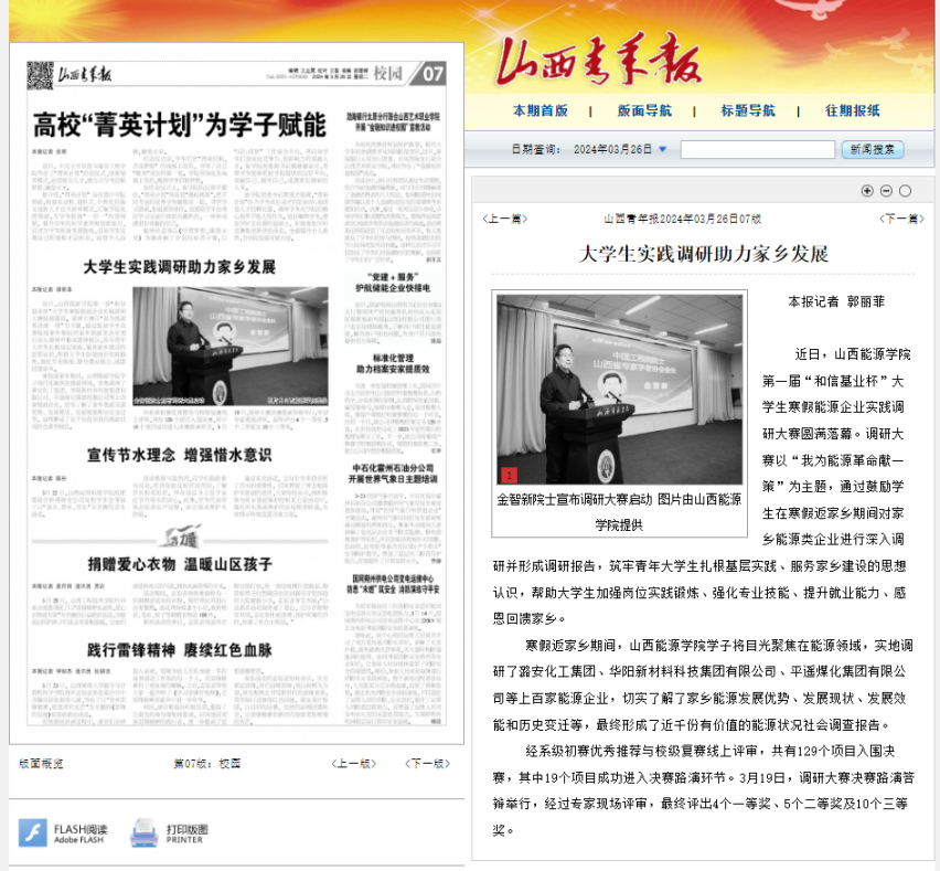 为深入贯彻习近平总书记关于青年工作的重要思想,筑牢青年大学生扎根基层实践、服务家乡建设的思想认识。今年寒假,校团委积极响应团中央、团省委号召,以迎接本科教学工作合格评估为契机,结合共青团基层组织改革,打造了大学生寒假“返家乡”“能源企业‘十百千’”社会实践特色品牌项目,旨在帮助大学生加强岗位实践锻炼、强化专业技能、提升就业能力、感恩回馈家乡。 为了打造好“能源企业‘十百千’”特色品牌项目,在山西和信基业科技股份有限公司的支持下,举办了我校第一届“和信基业杯”大学生寒假能源企业实践调研大赛。此次活动聚焦能源产业、关注生态环境、对接国家战略,是我校积极践行习近平生态文明思想,主动对接“美丽中国”建设的重要举措。活动期间,我校学子利用春节假期及大学生寒假返乡时间,聚集在能源领域有资源禀赋的山西省十个地市,走访了百个县区,深入到各类能源企业中,运用所学专业知识,对企业的能源结构、节能减排措施、技术创新、环保政策执行等情况进行全面而细致的调研,最终形成了近千份有价值的山西能源状况社会调查报告。此次活动还得到了省内媒体——《山西青年报》的报道,充分彰显了我校在引导青年学子积极投身社会实践,助力国家能源战略实施方面的突出成效,展现了山能学子们的卓越才华和实践能力。