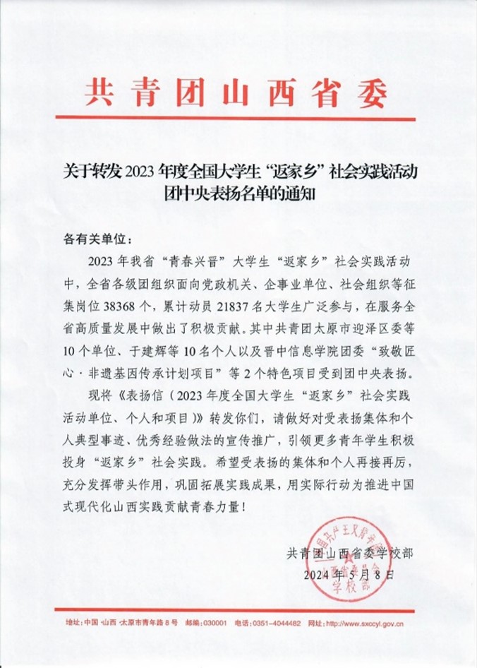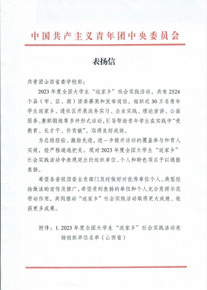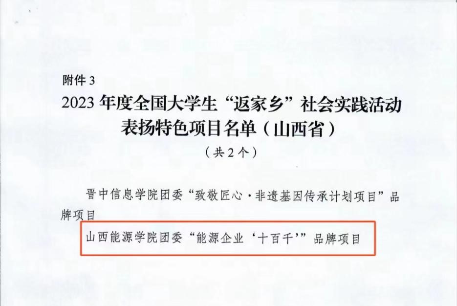 近日,我校收到共青团山西省委《关于转发2023年度全国大学生“返家乡”社会实践活动团中央表扬名单的通知》,我校团委“能源企业‘十百千’”特色品牌项目受到团中央表扬。