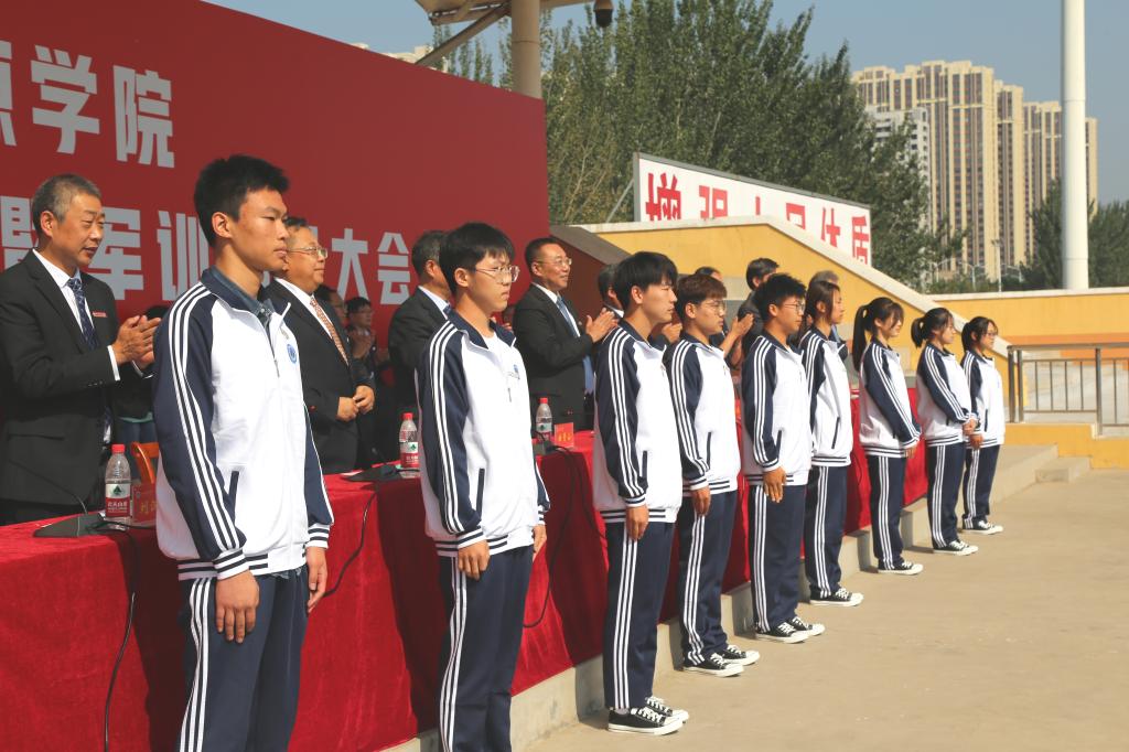 校党委副书记桑楠进行军训动员讲话。对全体参训人员提出了三点要求:一是全体参训同学要斗志昂扬、精神饱满。汲取军人正气担当,在训练实践中去除思想杂质,锻炼过硬品质,踏好人生发展的正步;学习军人的不怕苦、不怕累,坚韧不拔、拼搏到底的精神和毅力,高标准、严要求完成各项军训任务;严守纪律,听从指挥,服从命令,时刻把集体的利益放在首位,尊敬教官、团结同学、互相关心、互相照顾,走好班级连队的齐步。二是全体跟训辅导员要严格要求、率先垂范,细心、耐心地开展思想政治工作,确保军训达到良好的教育效果。三是全体参训工作人员要精心组织、保障有力。牢固树立安全第一的思想,力争在训练中帮助学生磨炼出顽强的意志,训练出强健的体魄,培养出拼搏的精神,确保2023级新生军训工作取得圆满成功。