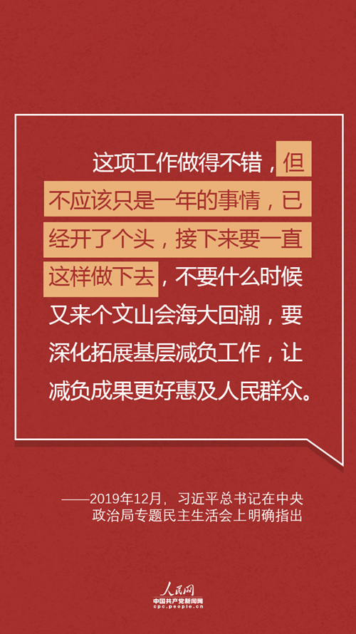 去年年底,习近平总书记在中央政治局专题民主生活会上明确指出,这项工作做得不错,但不应该只是一年的事情,已经开了个头,接下来要一直这样做下去,不要什么时候又来个文山会海大回潮,要深化拓展基层减负工作,让减负成果更好惠及人民群众。