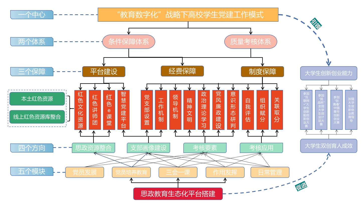 作为新建应用型本科高校,针对太阳集团官网各系学生党员作用发挥有限,学生党支部自身建设、组织制度建设、党员教育管理工作、党员发展工作力度不大等问题,基于二级院(系)党建目标,构建了“一个中心两个体系三个保障四个方向五个模块”的学生党建工作生态育人模式,一是完善思政教育体系的科学性和系统性,系统设计和制定涵盖制度保障、经费保障、平台建设和质量考核体系的顶层结构,兼顾“思政资源整合-支部画像建设-考核要素-考核应用”四个方向,紧贴“教育数字化”战略行动,强化线上和线下资源互释互融,使思政教育与时俱进并积极促进大学生创新创业能力培养,囊括“党员发展、党员培养教育、三会一课、作用发挥、日常管理”五个模块的多元化的生态化协同育人模式,构建一种具有生命活力的、内容丰富的、全民参与的生态育人模式。